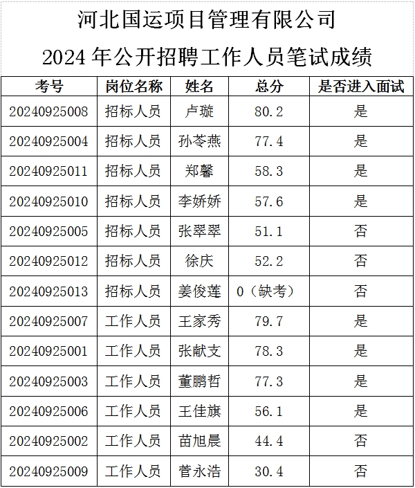 根據(jù)《河北國(guó)運(yùn)項(xiàng)目管理有限公司公開(kāi)招聘工作人員》招聘公告。于2024年9月25日對(duì)符合筆試資格條件的人員進(jìn)行了筆試,現(xiàn)將筆試成績(jī)予以公示。